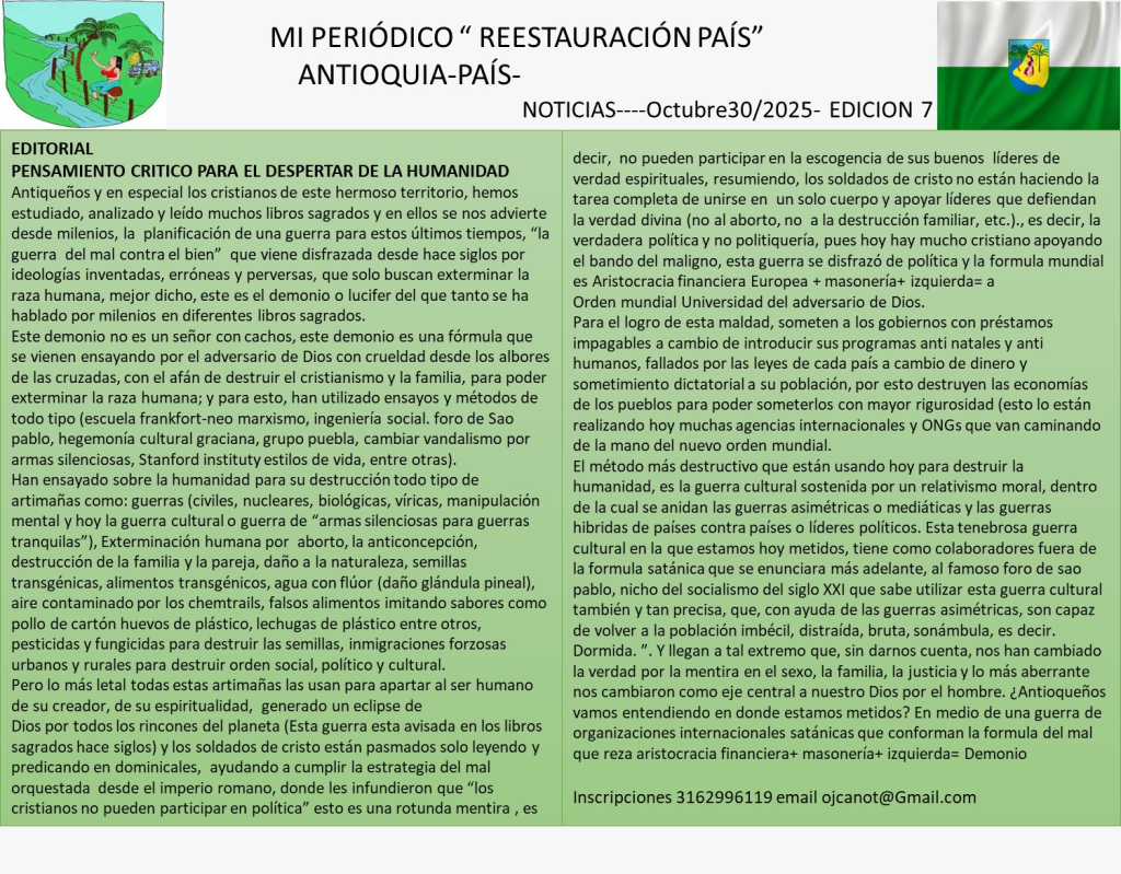 1. Desde la nueva República de ANTIOQUIA, invito a que todos los ANTIOQUEÑOS en los diferentes partes de nuestro territorio, grite y diga con el orgullo de un buen ANTIOQUEÑO, soy de la República de ANTIOQUIA. La tierra de Díos.